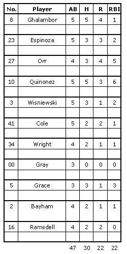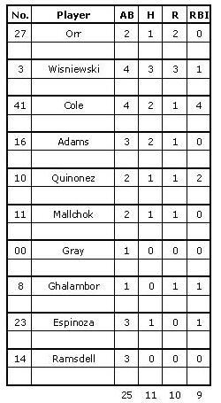 The top four hitters in the batting order, catcher Kevin Ghalambor, rightfielder Jesus Espinoza, third baseman Andrew Orr, and pitcher Carlo Quinonez, combined for 16 hits and 14 runs scored. Orr was a single shy of a cycle, including his first home run of the season, batting in 5 runs. Quinonez went 5 for 5 with a pair of triples and a double, and knocked in 6 runs.