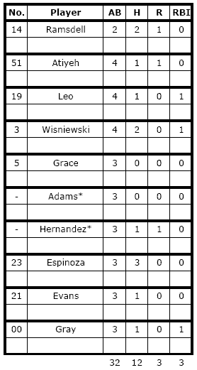Adams* struck out swinging in the first. Outfielder Joe Gray struck out on fouls in the second. Atiyeh struck out swinging twice. And Wisniewski struck out on fouls to end the game.